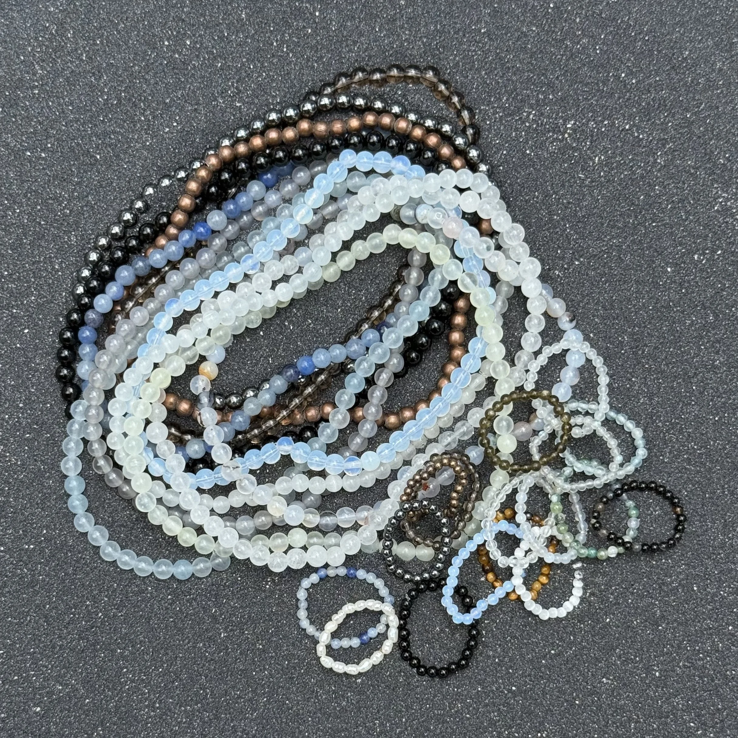 2mm beads hide an ultra-thin elastic cord; freshwater pearl rings are made with thread, not elastic. each ring is handmade in the us. inventory is exposed to daily sunlight and light from each full moon until its packed for order.